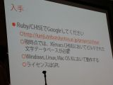 普段MS-Windowsを使っていない私にとって、MS-Windows向けのバイナリの区別はよくわからなかったのだけど、なかむら(う)さんの話を聞いていろいろ分かった。moriqさんの発表は実際に使われている例が出ているという点でよかったのだけど、時間をオーバーしすぎかなあ。内容に関係して思い出したのだけどcgi.rbではnkfを使わないようにするって話ではなかったかしら。アレは結構困った感じなのだよね。