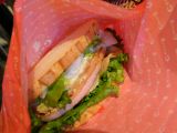 ハムステーキのサンドとローストビーフのサンドをたのんだのだけど、前者のほうがおいしかった。後者も悪くはない。食べごたえのあるサイズのハムステーキが入っている。サンドのパンの長さ(横長なので)が普通のハンバーガーの直径の1.5倍くらいで、それからさらにはみ出るくらいのサイズだった(写真では分かりにくいが、さらに奥に伸びている)。