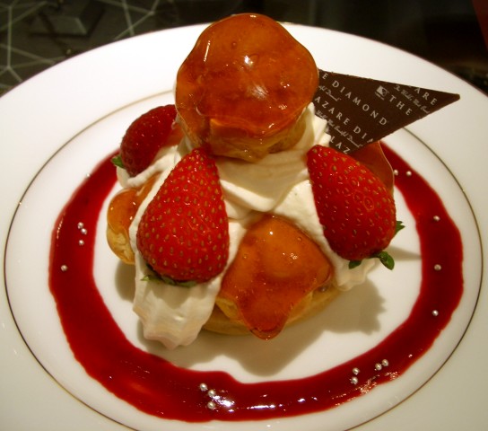 写真はセットに付けたデザート。ミニシュークリームのシューをクッキー生地にした感じのものが5つか6つあって、その間に苺が一つ。各ミニシューには飴状のカラメルがかかっている。苦味のあるカラメルと中のカスタードが良く合う。土台にもクッキーがあってボリュームもある。+350円でこれならお得かな。