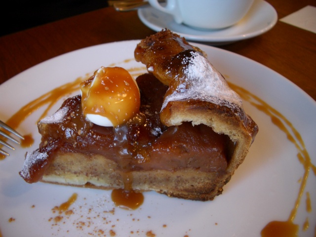 一階のショーケースで見てたときにはさほど気にならなかったのだけど、お皿に乗って目の前にやってきたアップルパイはでっかかった。控えめに見ても普通のケーキの1.5倍は軽くある。味のほうはと言うとカラメルがかかっていて甘め。パイ生地はサクッとしていてなかなか良い。それにしても食べごたえがある。