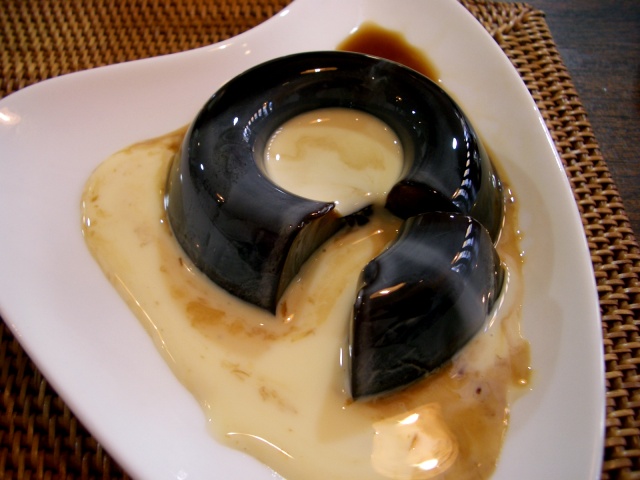 コーヒーゼリーは甘味の入っていない苦味の効いたもの。かかっているシロップはこれもナッツ系の風味のある甘いもの。味自体にちょっとクセがあるけどバランスの良い苦甘がおいしい。