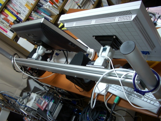 で結局、両者の中間的な少し変った形の、レールに取り付けるVESAアームを買うことにした。アームであるLA-37PAを二つとレール付きのスタンドであるPA-01を一つで28,000円ほど。今使っている17インチと21インチの両方をこれ一つでまかなえることを考えればほどほどの値段と言える。モニタ本体の下にはスペースができるからキーボードを押しやっておくこともできる。リスペースFだと余計な棚なんかが付いているので圧迫感がありそうだとも思っていたのだけど、これならシンプルでスッキリしそうだと良いことずくめ。……もちろんそう思った時点では単なる想像でしかなかったわけだけど。