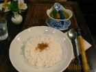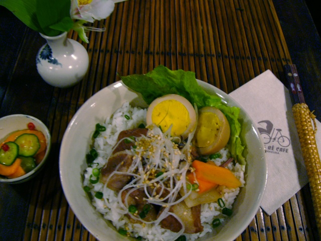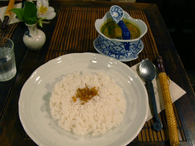 じゃあ、あっちにしよう。ということになったのは、その店に行く途中にあるSONG BE CAFE。平日の少々遅めの時刻ということで他に客の姿はなく貸切り状態。ほうれん草のグリーンカレー、豚と玉子の氷砂糖煮丼、生春巻をたのんだ。