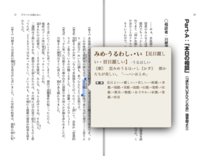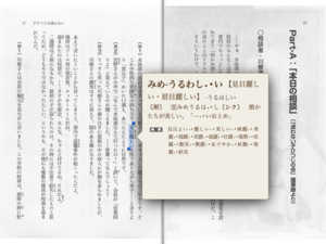 動作確認には、紙が薄いことがよく知られている角川スニーカー文庫をスキャンしたものを使ったた。同文庫は紙のまま読んでいてもよく透ける。スキャン結果もそれに応じたものとなる。下は生成されたPDFと処理したPDFをi文庫で参照したときのスクリーンショットである。